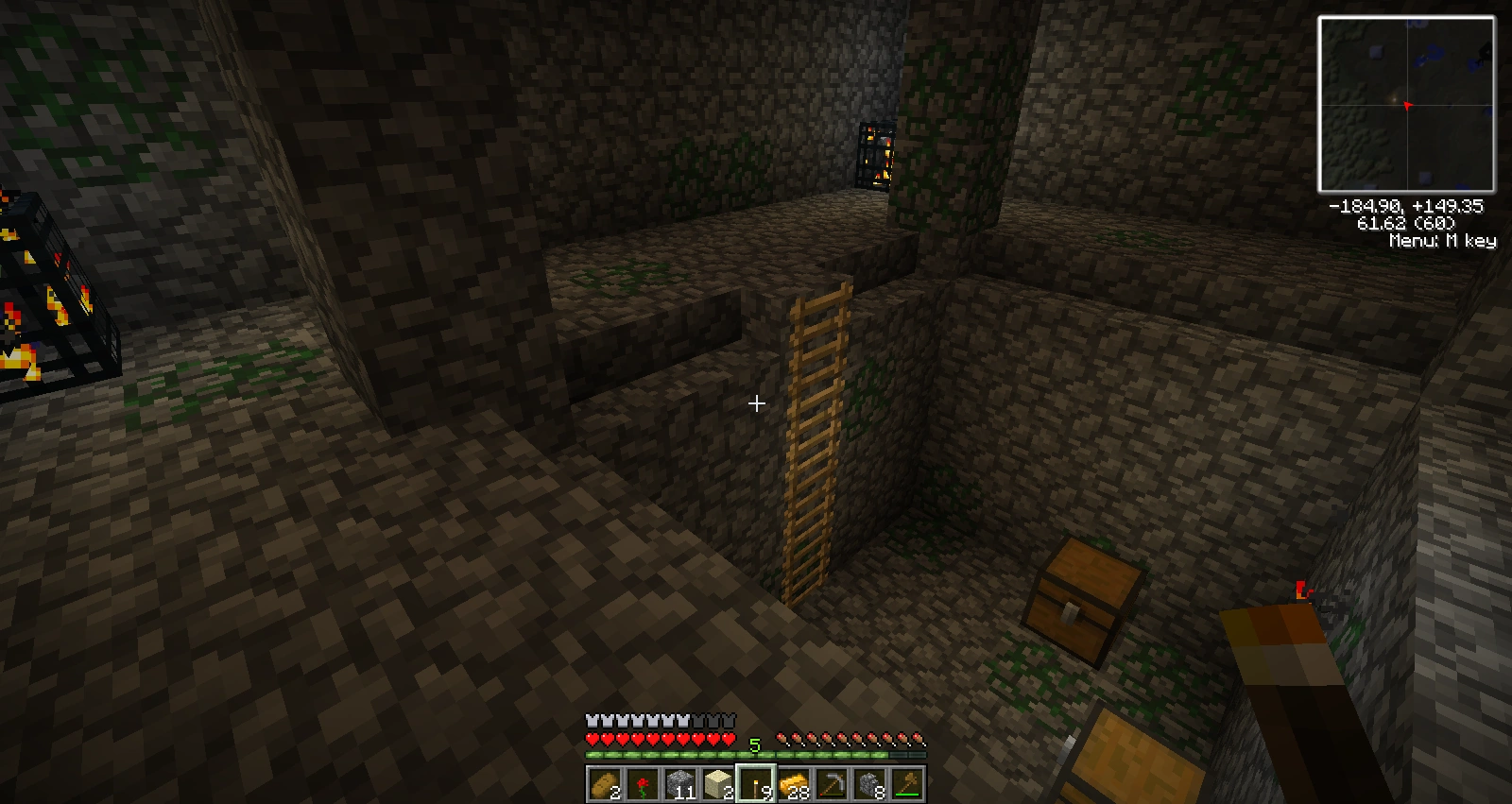 This entrance is blocked by two pieces of iron gate. Once inside, you find yourself in a ring-shaped upper level, featuring four columns with cobble steps as decoration, and a stairway in the northeast corner leading down to the main floor. (By this time, the mob spawners will be reacting to your presence, so a good strategy is to knock mobs into the central pit.)