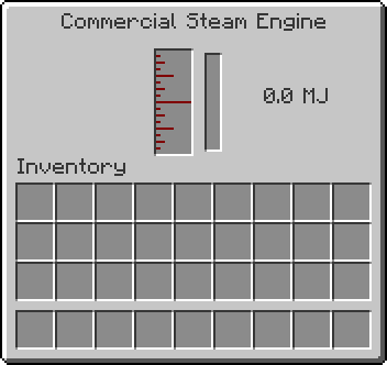 The Commercial Steam Engine is an engine that requires an external Steam supply, such as a Steam Boiler.